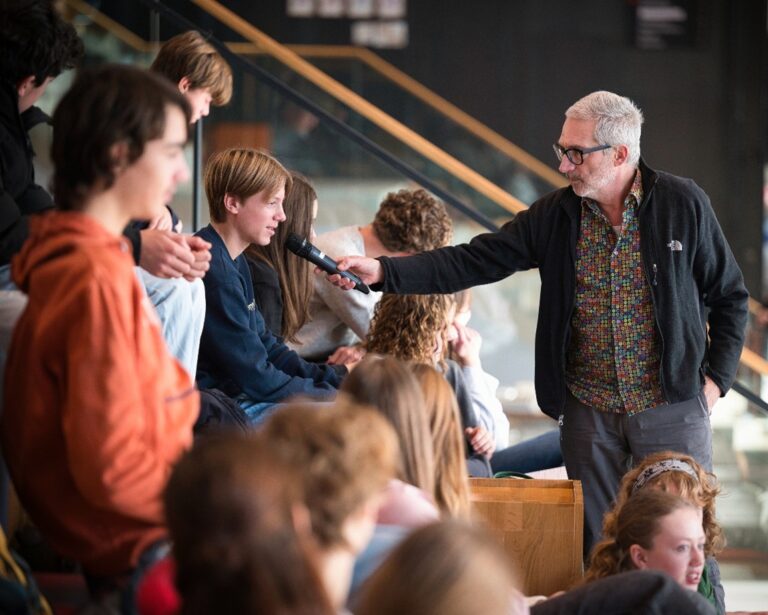 Frenk van der Linden in gesprek met leerlingen uit vwo-4